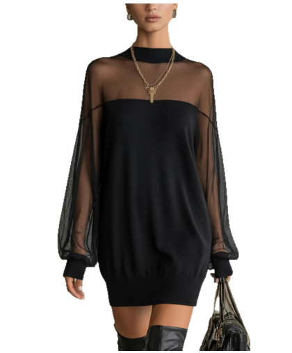 Womens European And American-style Springautumn Mesh Patchwork Mini Skirt O Neck Long Sleeve Pullover Party Dresses